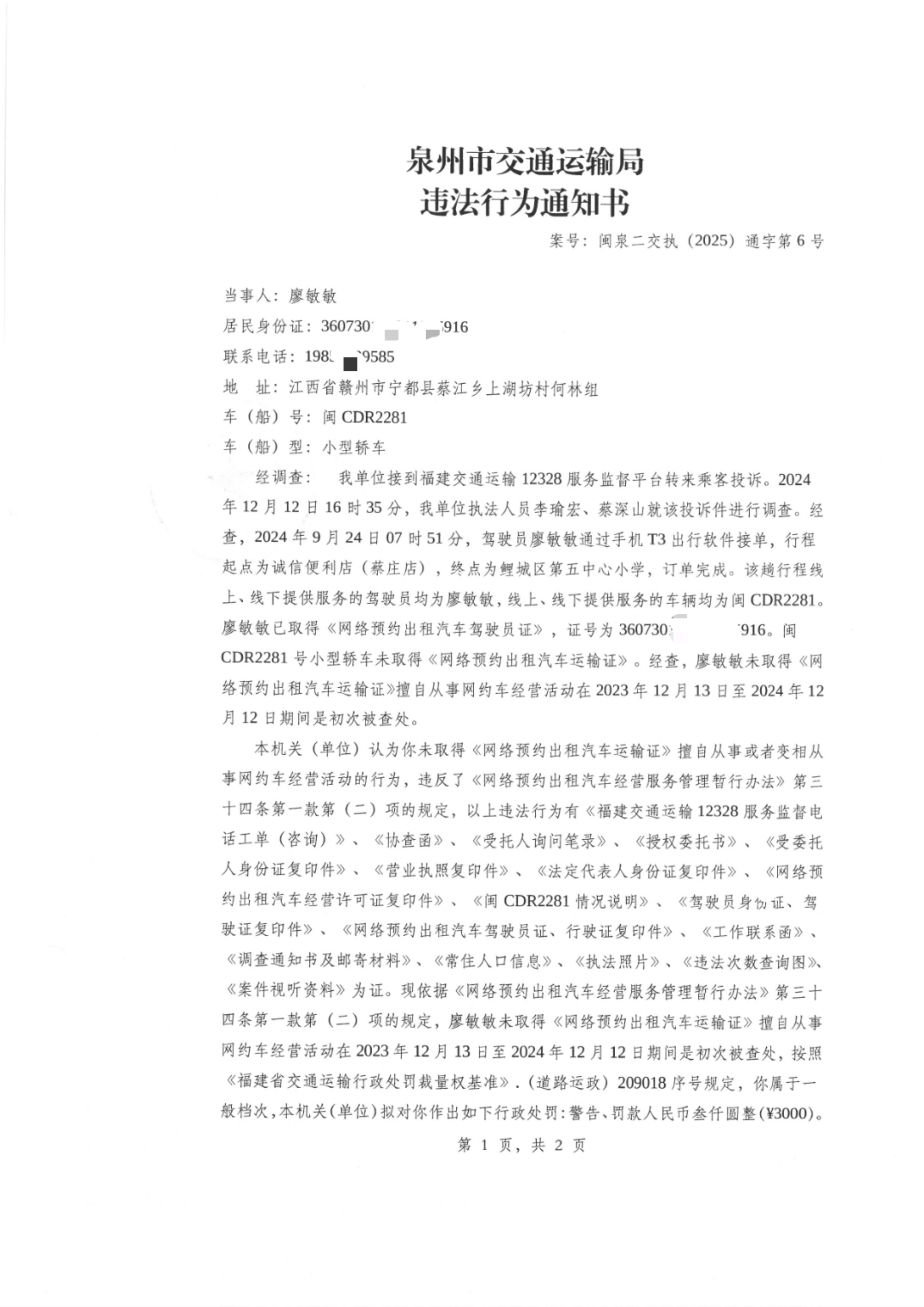 附件:《学生妹制服色情 违法行为通知书》(闽泉二交执(2025)通字第6号)