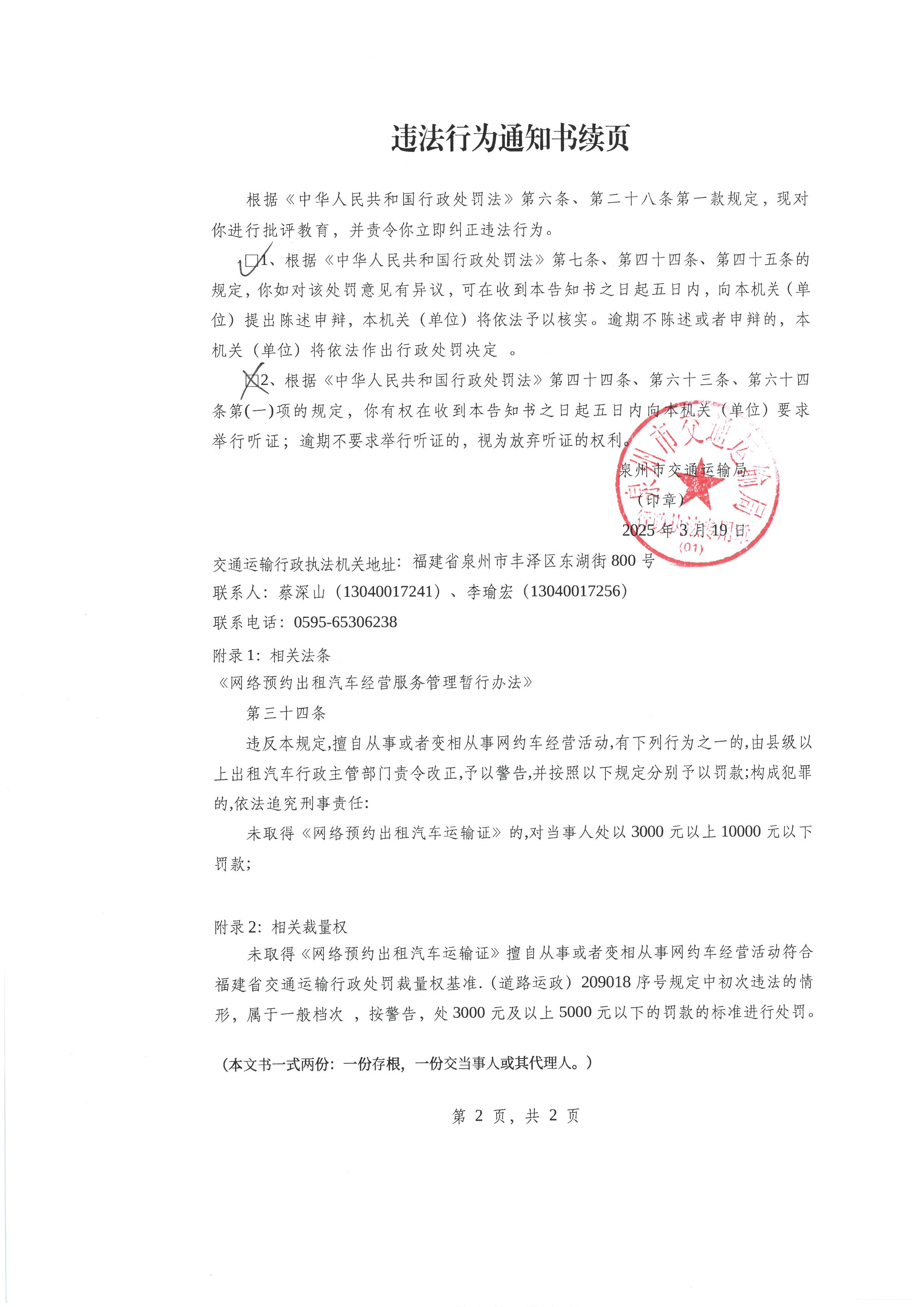 本机关于2025年3月19日对你(单位)未取得《网络预约出租汽车运输证》擅自从事网约车经营活动案拟作出警告、罚款人民币叁仟圆整的行政处罚决定。同时,根据《中华人民共和国行政处罚法》第六条、第二十八条第一款规定,对你(单位)进行批评教育,并责令你(单位)立即纠正上述违法行为。