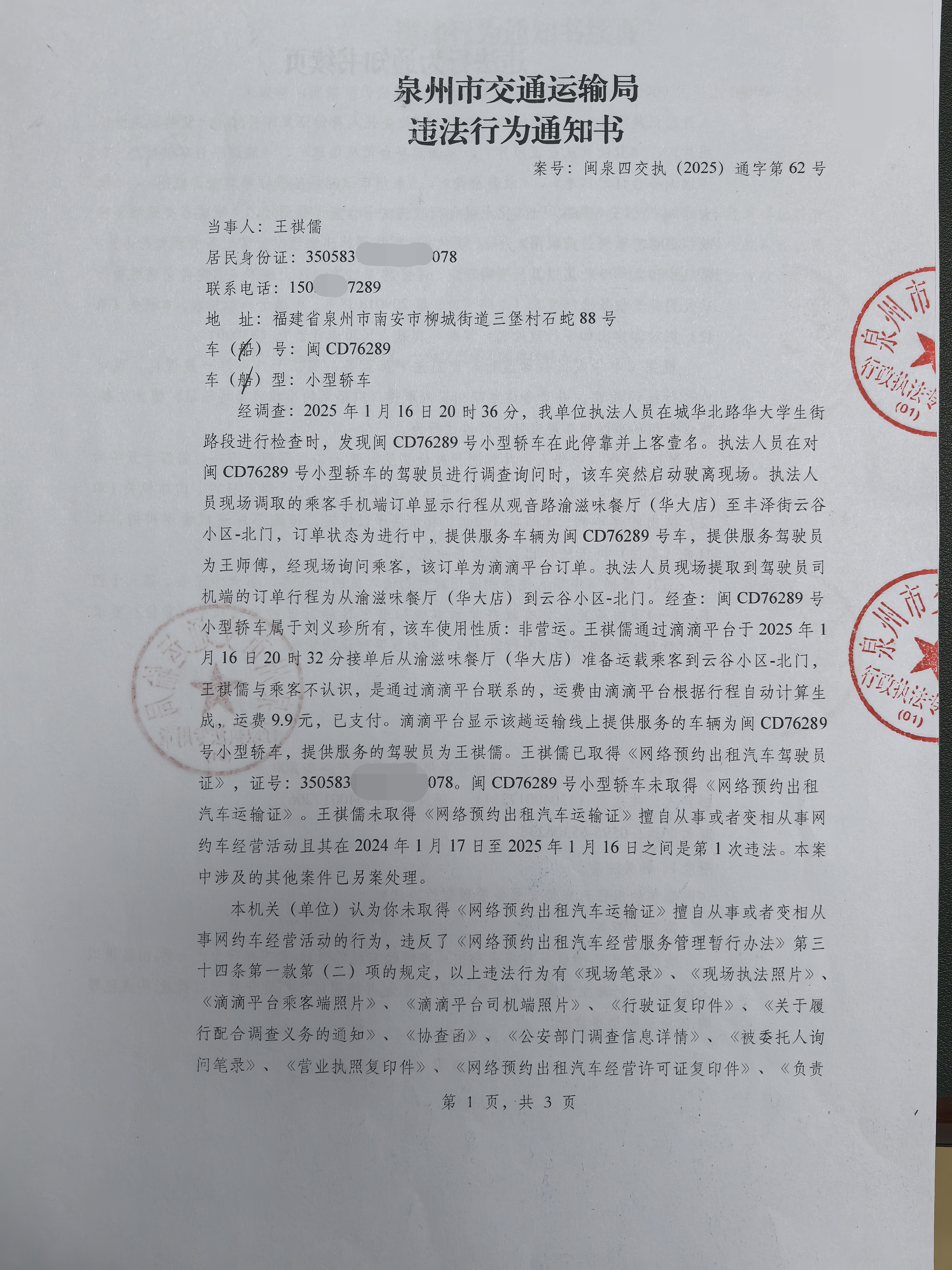 附件:《违法行为通知书》{闽泉四交执(2025)通字第62号}