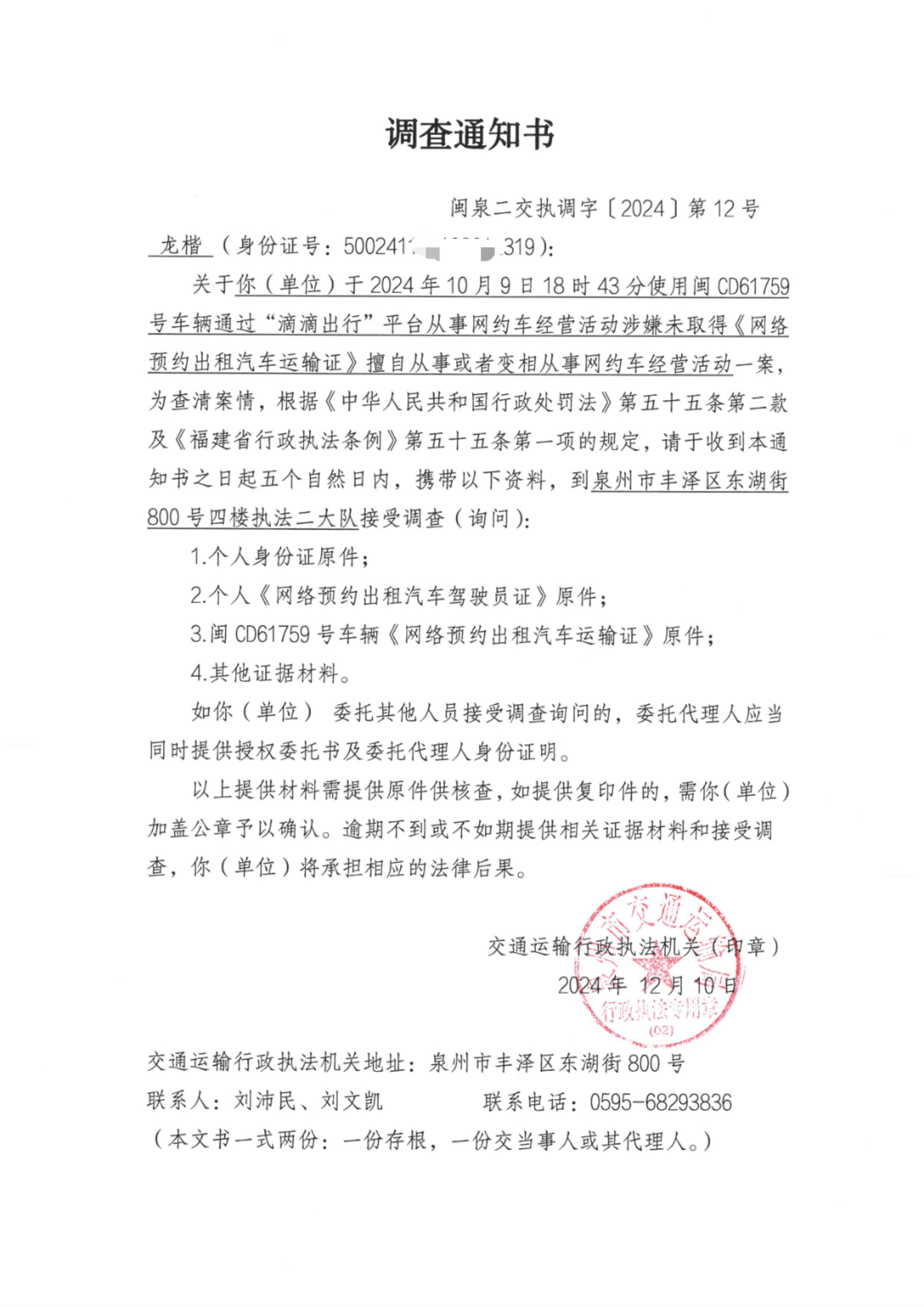 关于你于2024年10月9日18时43分使用闽CD61759号车辆通过“滴滴出行”平台从事网约车经营活动涉嫌未取得《网络预约出租汽车运输证》擅自从事或者变相从事网约车经营活动一案,为查清案情,根据《中华人民共和国行政处罚法》第五十五条第二款及《福建省行政执法条例》第五十五条第一项的规定,请于收到本通知书之日起五个自然日内,携带以下资料,到学生妹色情 丰泽区东湖街800号四楼执法二大队接受调查(询问):
